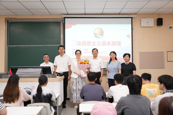 2025年秋季学期开学的第一天校党委书记董必荣教授一早来到教学楼,走进何洁老师主讲的《马克思主义基本原理》课堂。在新学期第一堂思政课课前,董必荣书记为何洁老师送上鲜花。肯定了何洁老师在教学科研中的贡献,强调马克思主义学院教师肩负着“培根铸魂”的神圣使命思政课教师是学生成长成才的指导者和引路人感谢所有思政课教师为学校立德树人工作和思政教育作出的贡献。