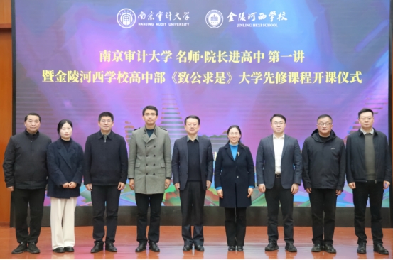 12月3日, 南京审计大学“名师·院长”进高中全国第一讲暨《致公求是》大学先修课程开课仪式在金陵河西高中部举行。我院党总支书记杨飞出席此次活动。