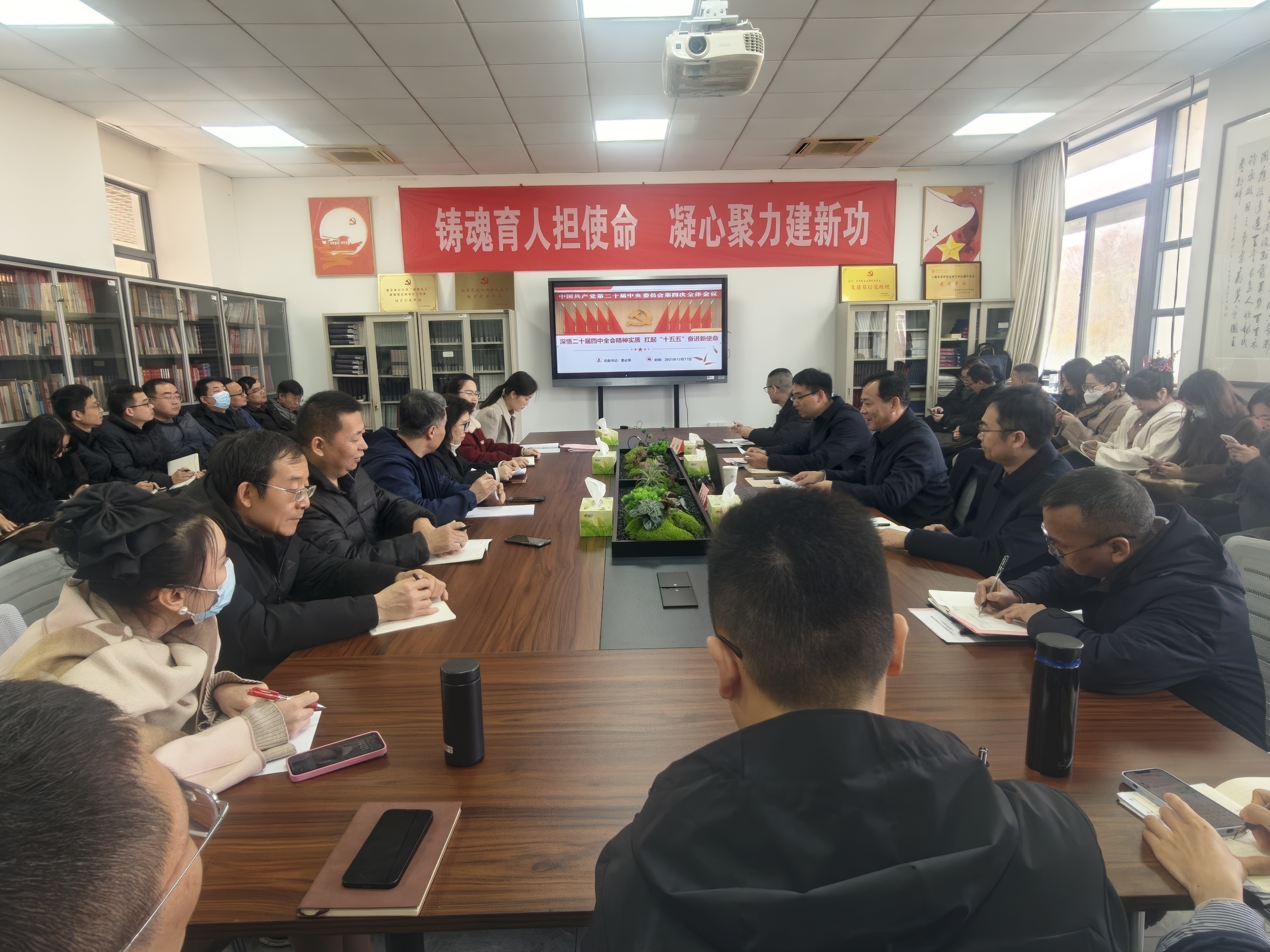 为深入学习贯彻党的二十届四中全会精神,推动党的二十届四中全会精神融入思政课教学,12月17日下午,校党委书记董必荣教授来到马克思主义学院,为全体教职工讲授党的二十届四中全会精神专题党课,学院全体班子成员、全体教职工参加。会议由党总支书记杨飞主持。